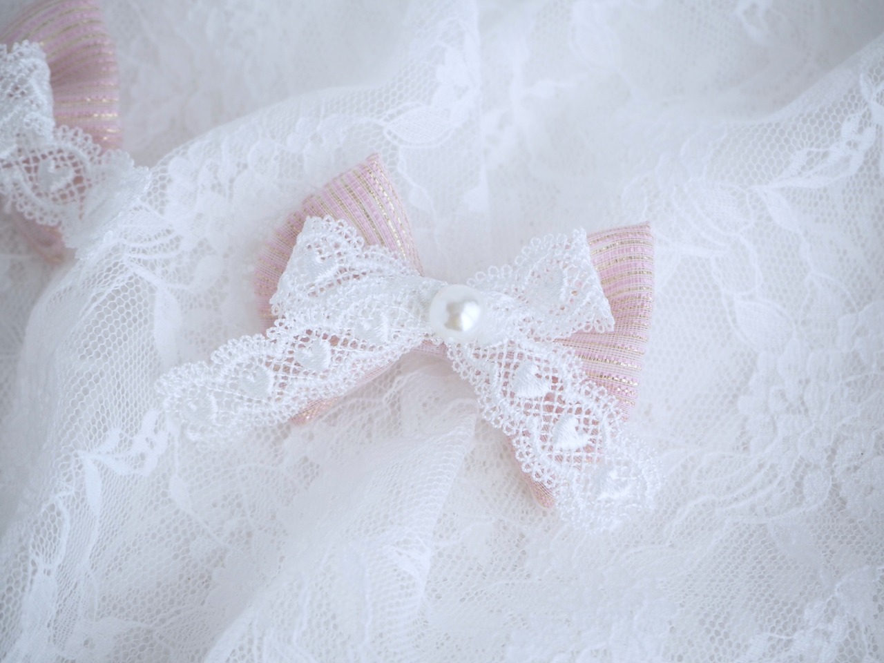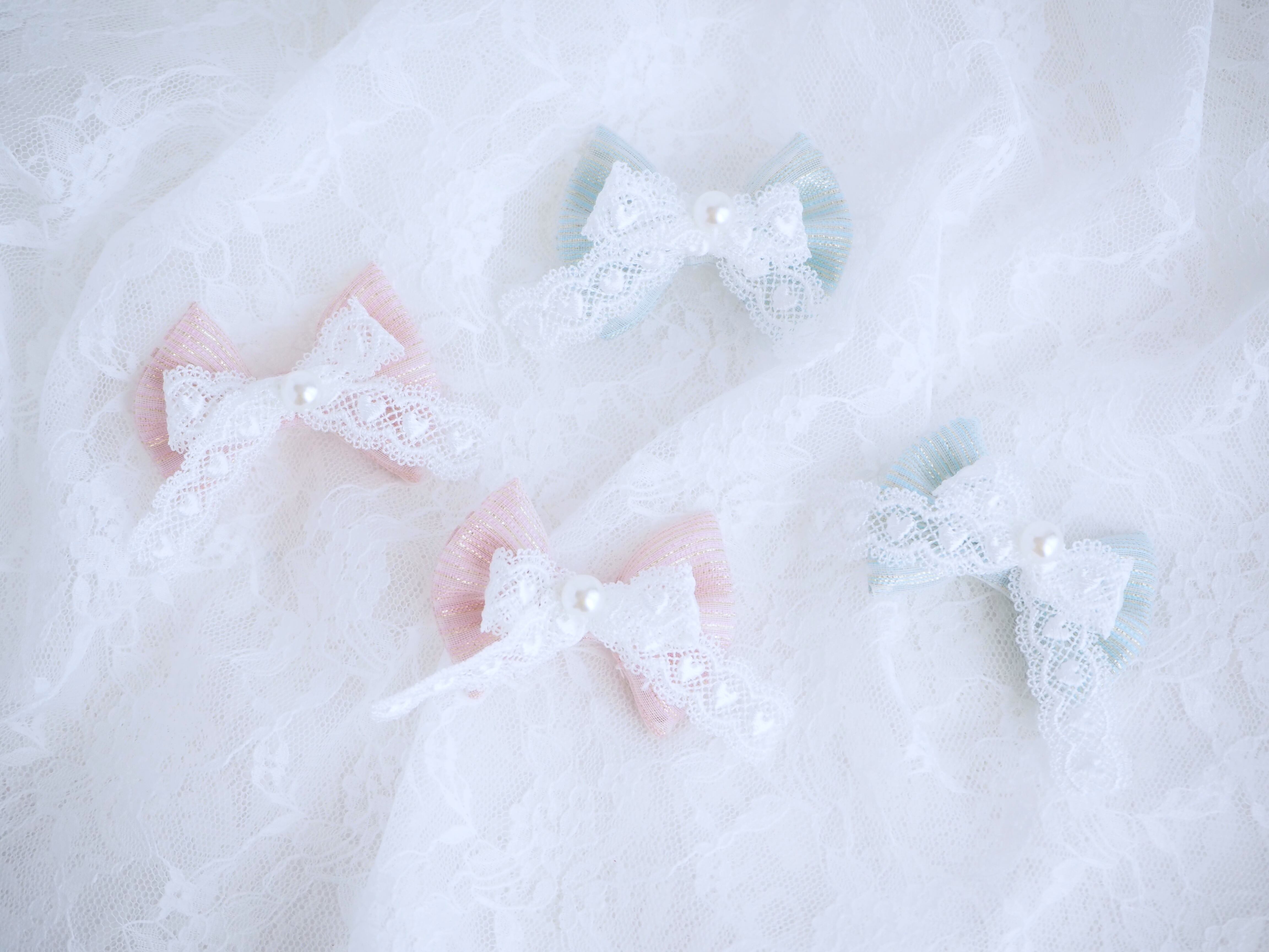 金糸入りリボンとハートレースのツインテール耳飾り リボン うさぎ用 ペット